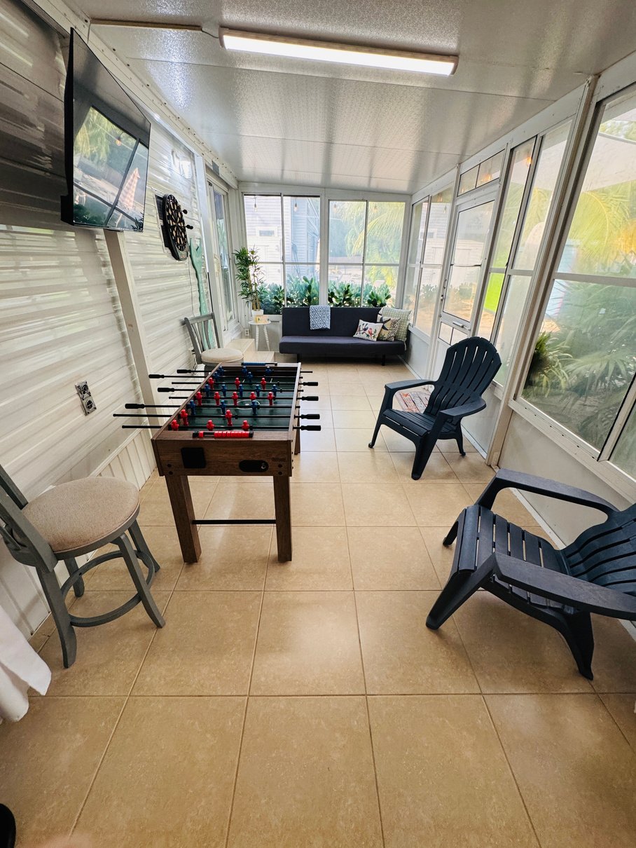 The home offers two living room areas, a kitchen, dining room table, one bathroom, plenty of entertainment options (including a Foosball table, dart board, and board games), and three sleeping areas to fit up to 6 people.